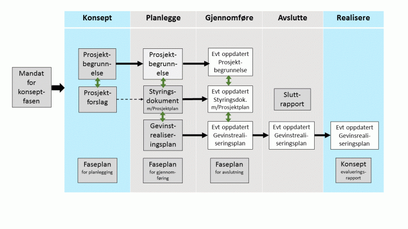 Figuren nedenfor viser i hvilken fase de ulike dokumentene skal opprettes (grå bunnfarge), og i hvilke faser de bare skal oppdateres ved behov (hvit bunnfarge). I planleggingsfasen er prosjektbegrunnelsen markert med litt lysere gråfarge fordi den alltid bør oppdateres her.