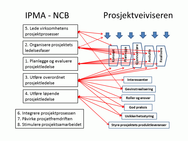 Prosjektveiviseren beskriver ikke alle temaer som prosjektleder/delprosjektleder trenger for planlegging og oppfølging av prosjektets gjennomføring. Kunnskap om disse må hentes fra andre kilder, for eksempel IPMA NCB®. Hensikten med figuren nedenfor er å synliggjøre relasjonene mellom strukturen i IPMA NCB og Prosjektveiviseren. Stiplede piler antyder noe svakere knytninger enn de heltrukne pilene.