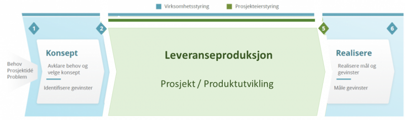 Ved å klikke på prosesspilen ovenfor finner du beskrivelser av fasene og beslutningspunktene, fra prosjektets idé og konsept, via etablering, gjennomføring og avslutning av prosjektet, til virksomhetens realisering av gevinster.