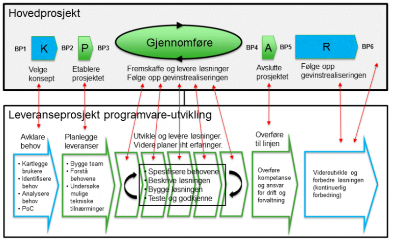 Prosjektveiviseren kan betraktes som hovedprosjektets styringsmodell. I leveranseprosjektet for programvareutvikling er gjennomføringen knyttet opp mot et hensiktsmessig valg av utviklingsmetode.