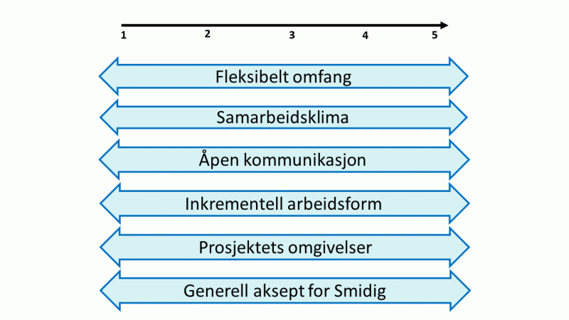 Vurder hvilken modenhet ditt prosjekt og din linjeorganisasjon har innenfor hvert av de seks områdene, og hva som er positivt eller negativt med tanke på forutsetninger for en god bruk av smidige metoder. Plasser ditt prosjekt/prosjektomgivelse på skalaen 1-5 for hvert av de seks områdene. Det anbefales IKKE å beregne et gjennomsnitt for alle områdene og bruke dette som et oppsummert svar på om prosjektet skal basere seg på Smidig eller ikke. Ta heller hensyn til vurderingen av hvert av områdene hver for seg. Vær bevisst på at områder dere har vurdert til å ligge langt til venstre på skalaen vil være forbundet med usikkerhet knyttet til bruk av smidig metodikk i prosjektet. Tilpass prosjektets gjennomføring i henhold til dette, og iverksett gjerne tiltak som motvirker denne usikkerheten.